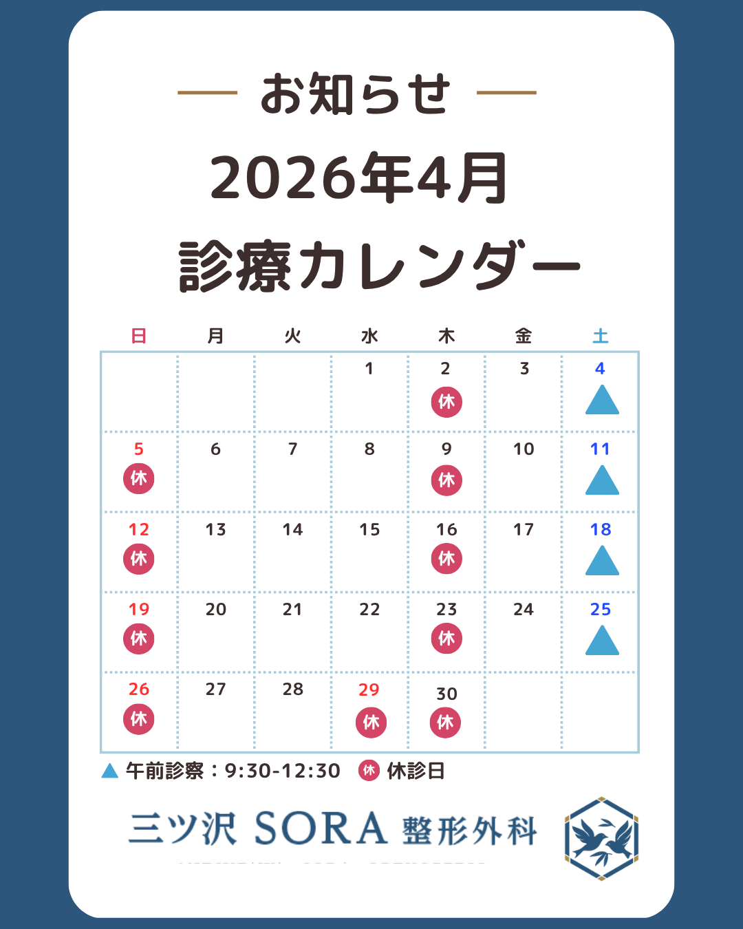 こんにちは、三ツ沢SORA整形外科です。 新年度が始まる4月の診療スケジュールをお知らせします。